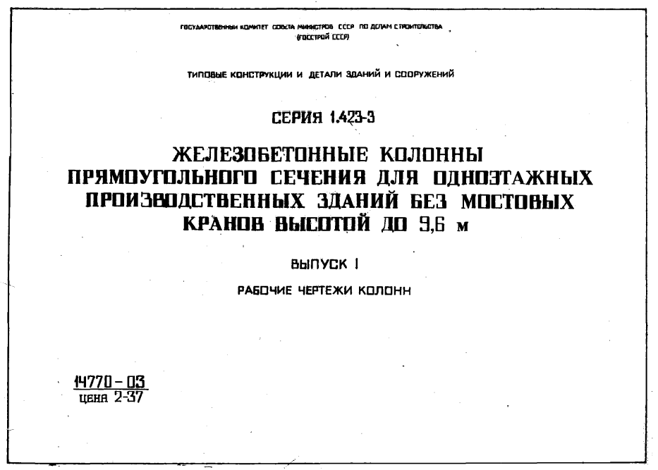 Серия 1.423-3. Железобетонные колонны прямоугольного сечения для одноэтажных производственных зданий без мостовых кранов высотой до 9.6 м