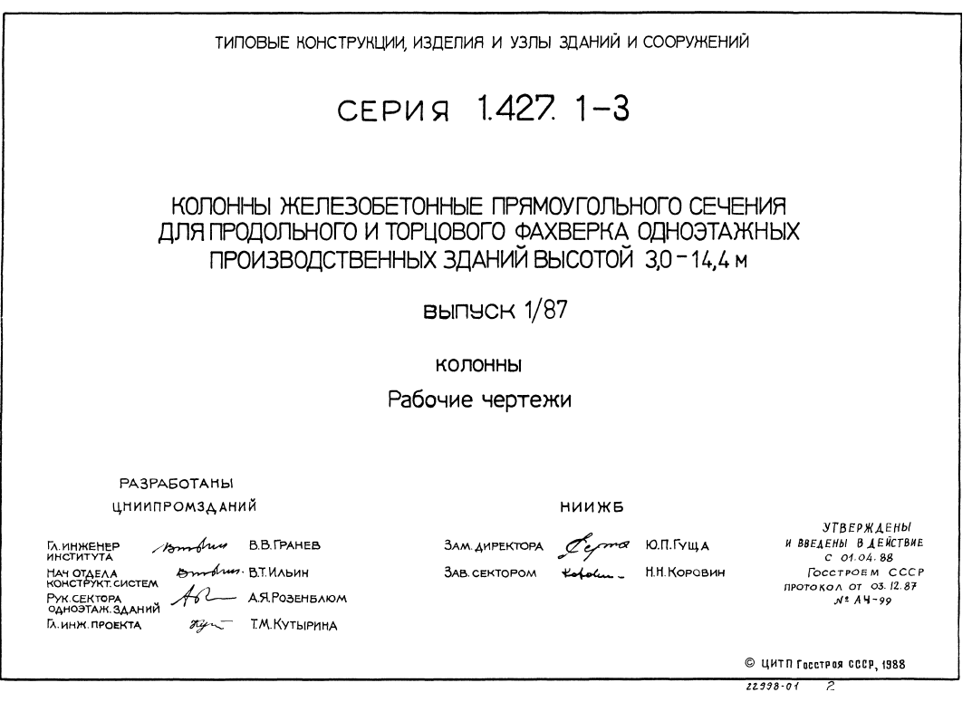 Серия 1.427.1-3. Колонны железобетонные прямоугольного сечения для продольного и торцового фахверка одноэтажных производственных зданий высотой 3.0-14.4 м